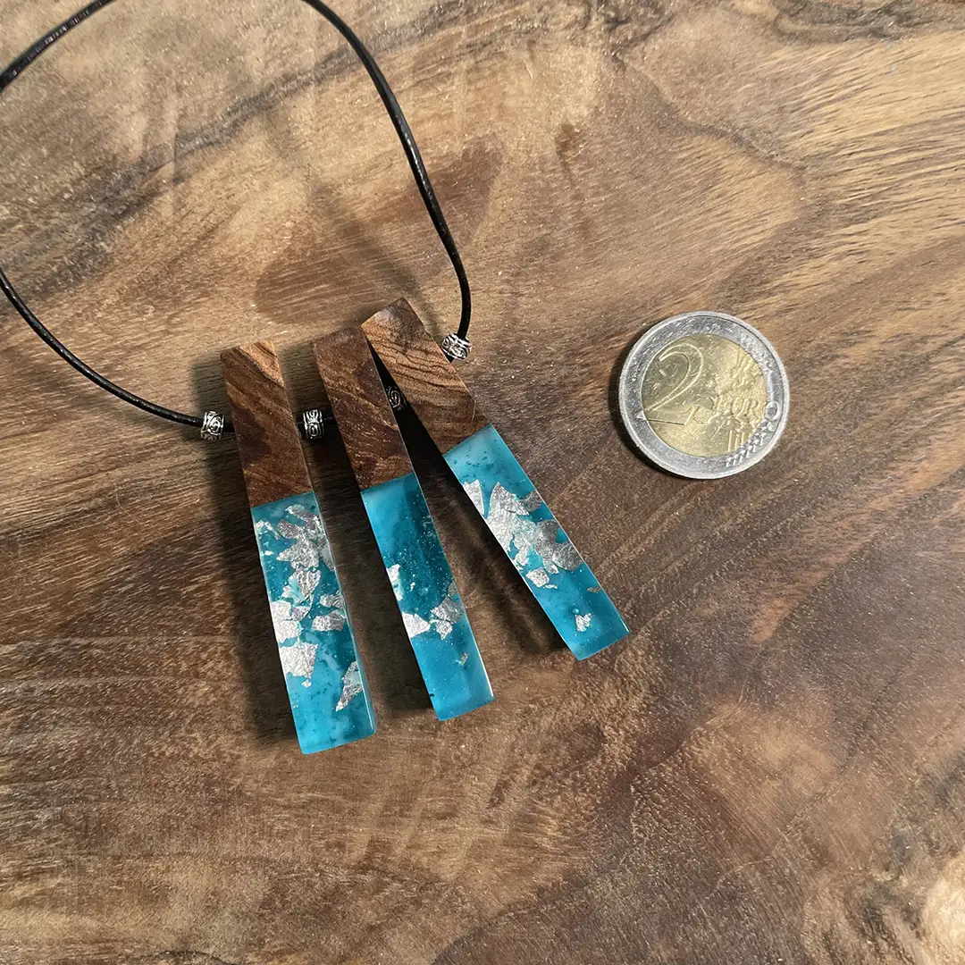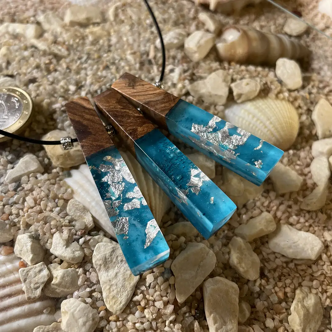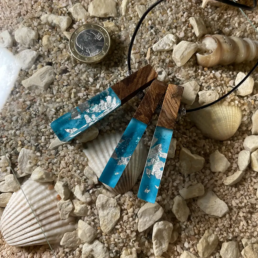 Drei an der Schnur – Eine Einheit. Kettenanhänger Blue Sticks aus einem Stück Holz mit blauem Kunstharz und Blattsilber Einlagen.