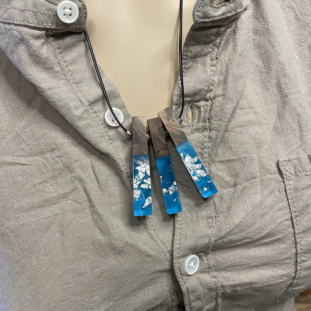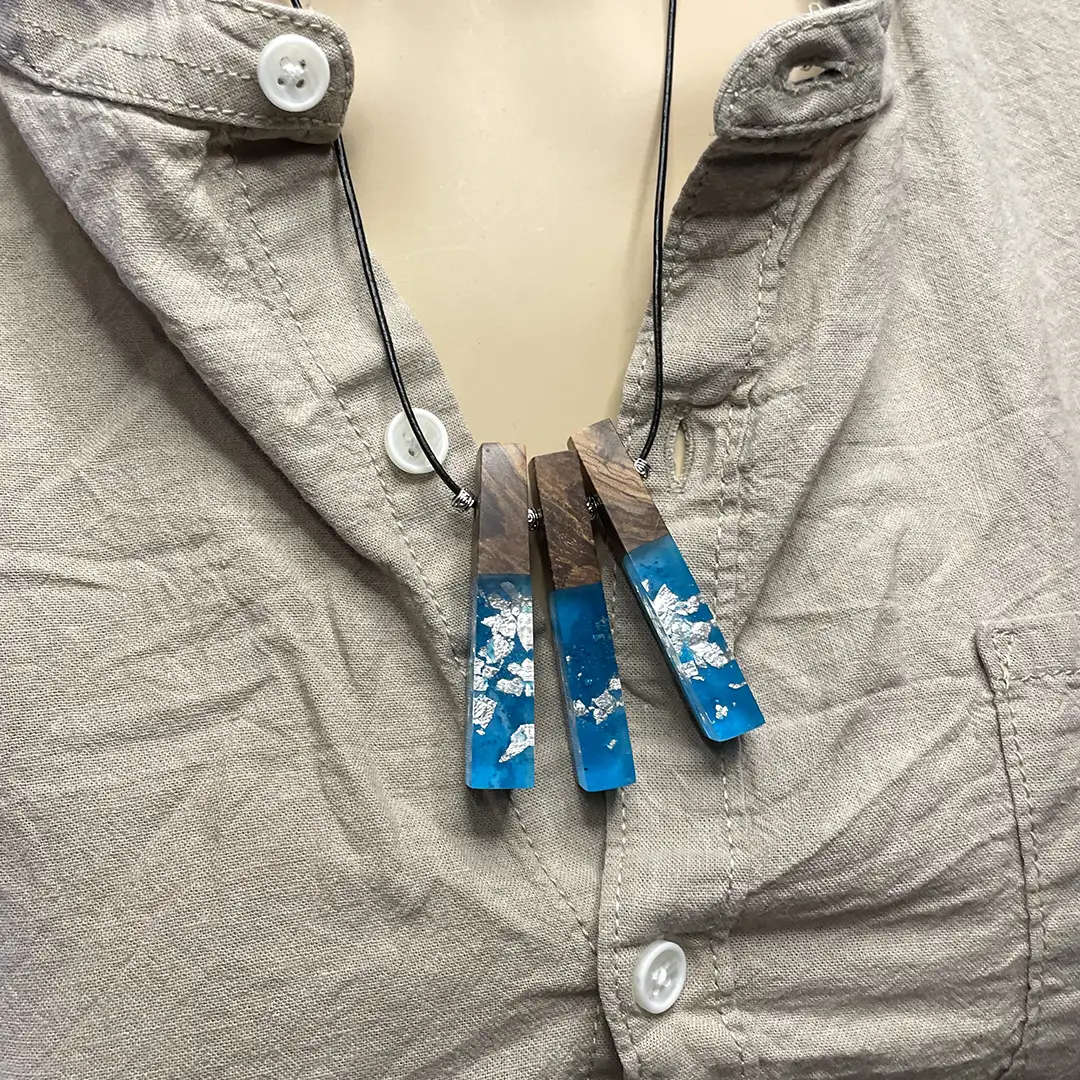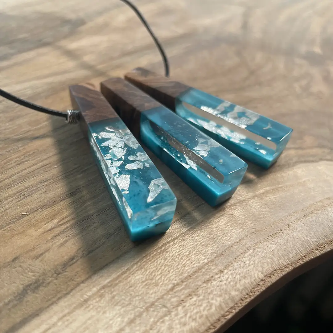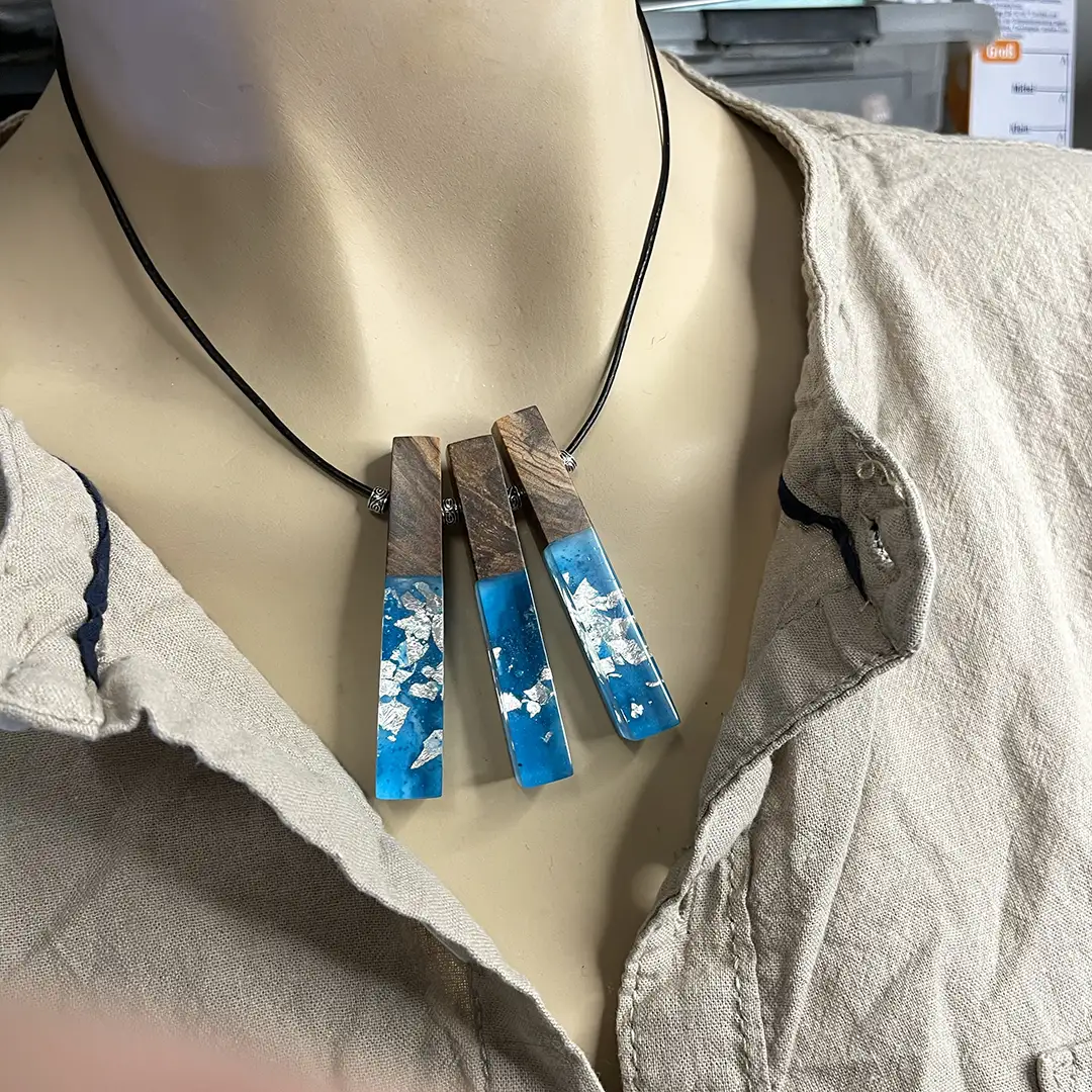 Drei an der Schnur – Eine Einheit. Kettenanhänger Blue Sticks aus einem Stück Holz mit blauem Kunstharz und Blattsilber Einlagen.
