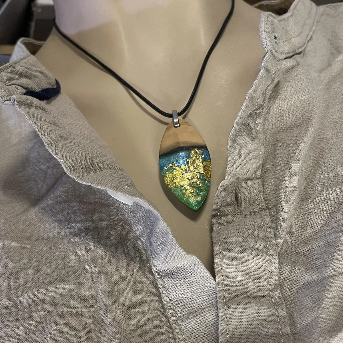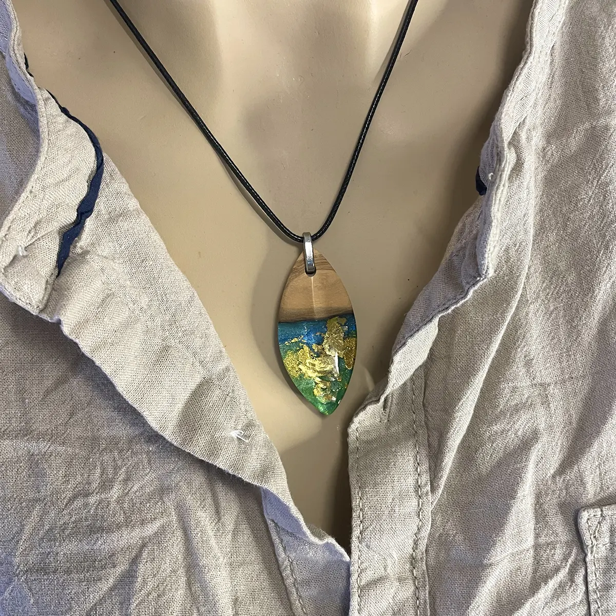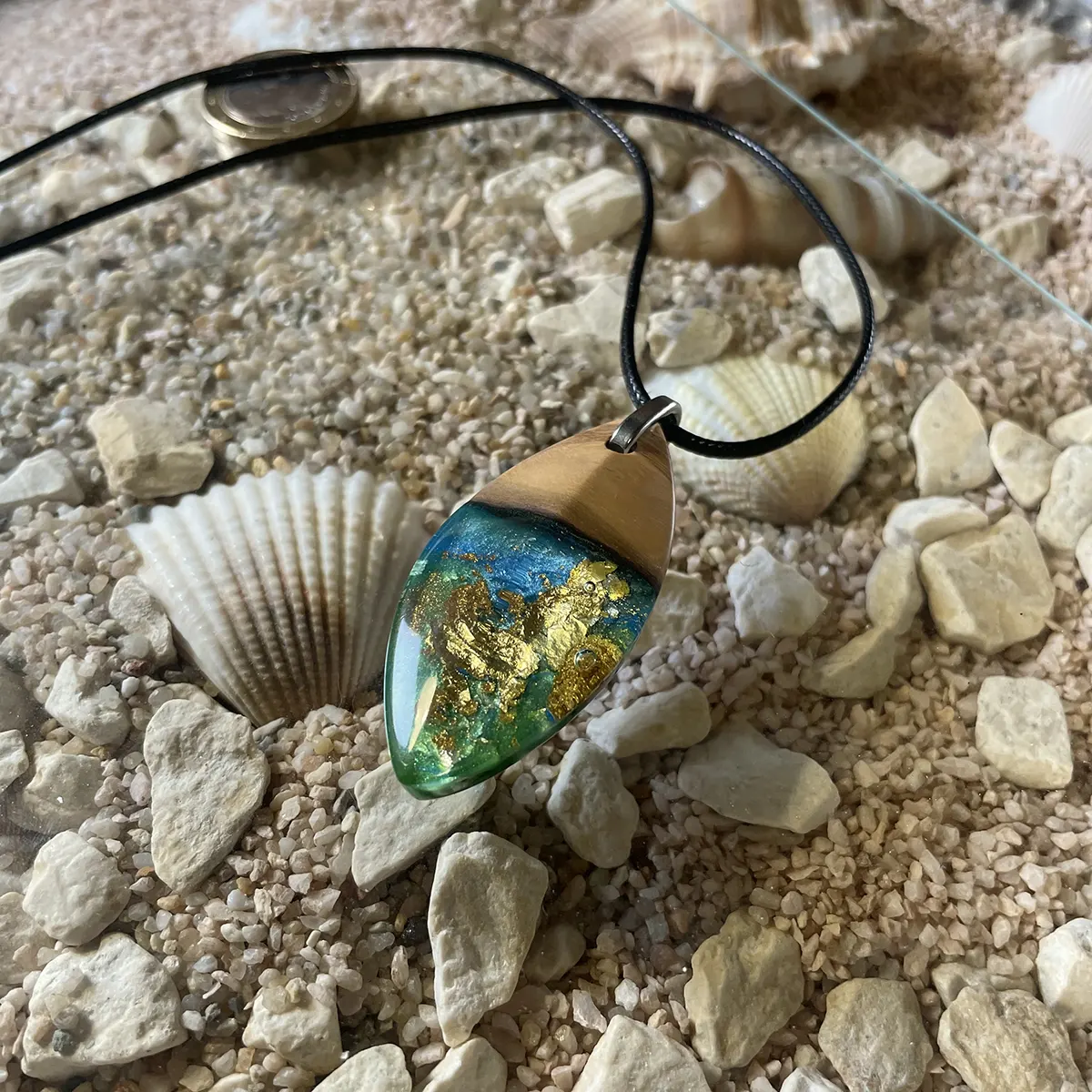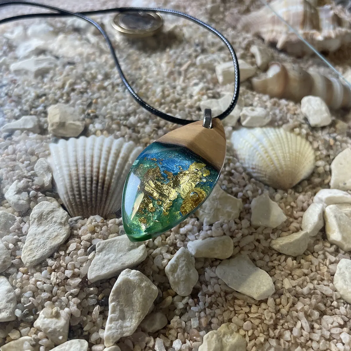Dieser Kettenanhänger ist ein wunderschön handgefertigtes Einzelstück, kombiniert aus Olivenholz und blau gefärbten Resin/Kunstharz mit Blattgold-Einlagen. Ein wundervolles Geschenk für alle Anlässe und ein echter Hingucker.