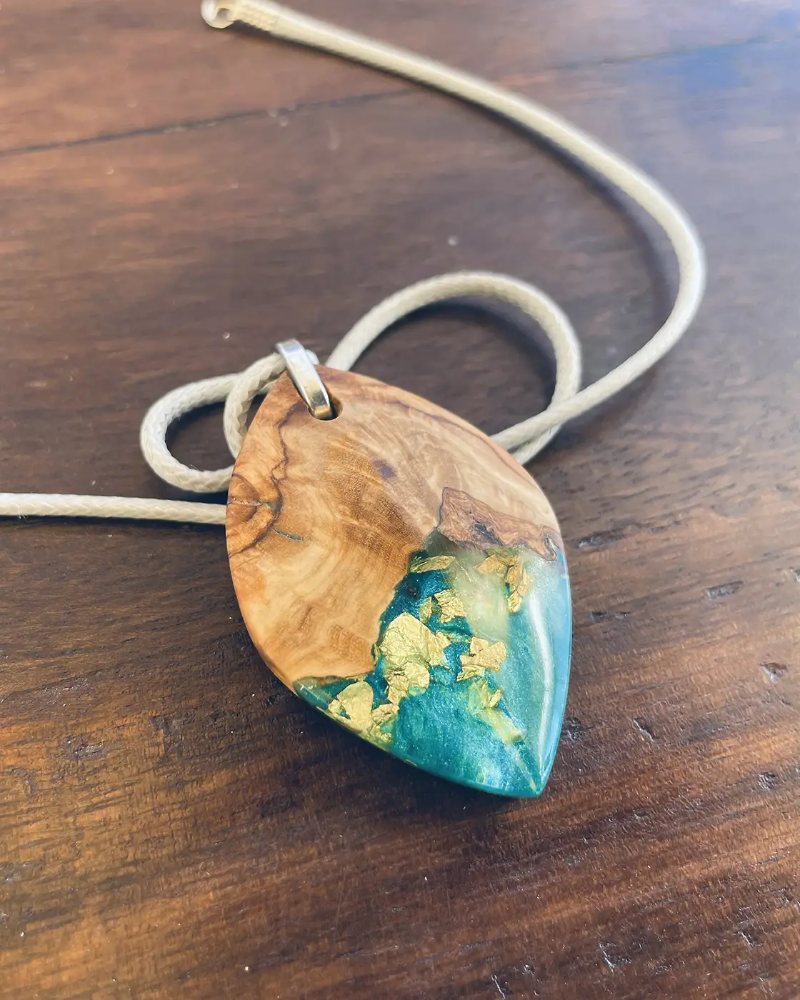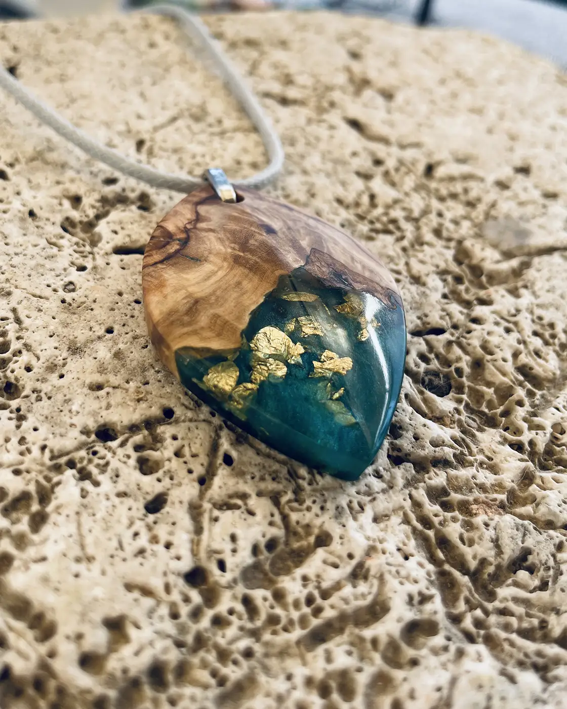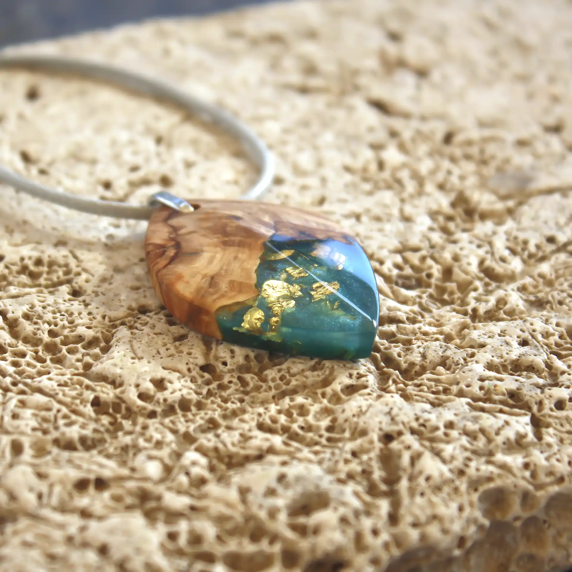 Dieser Kettenanhänger in ist ein wunderschön handgefertigtes Einzelstück, kombiniert aus Olivenholz und grün/gold gefärbten Resin/Kunstharz. Ein wundervolles Geschenk für alle Anlässe und ein echter Hingucker.